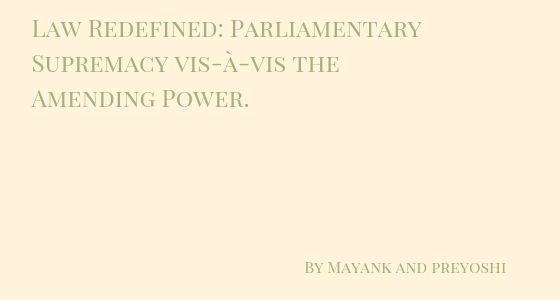 By Mayank and Preyoshi This case-by-case analysis is done in order to determine how the law regarding 'What can be amended?' has been evolved. This article shall presue the following landmark judgements, namely, Shankari Prasad v. Union of India, L. C. Golak Nath V. State of Punjab, Kesavananda Bharti v. State of Kerala, Indira Nehru … Continue reading Law Redefined: Parliamentary Supremacy vis-à-vis the Amending Power